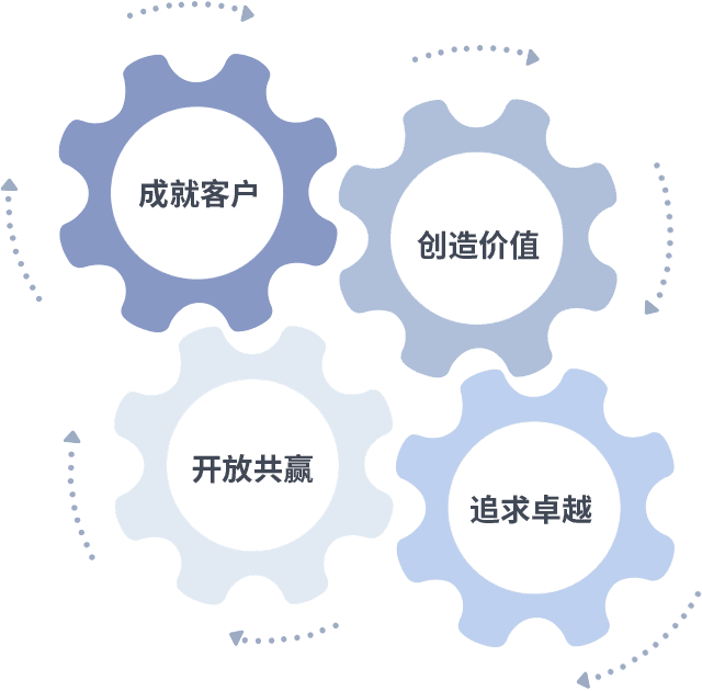 成就客户是一切决策的出发点,,创造价值是衡量所有工作的标准,,,追求卓越是我们做事做人的态度,,,,开放共赢是我们的格局也是最终的结果。。。价值观的齿轮环环相扣,,,推动着组织里的每个人不断向前。。