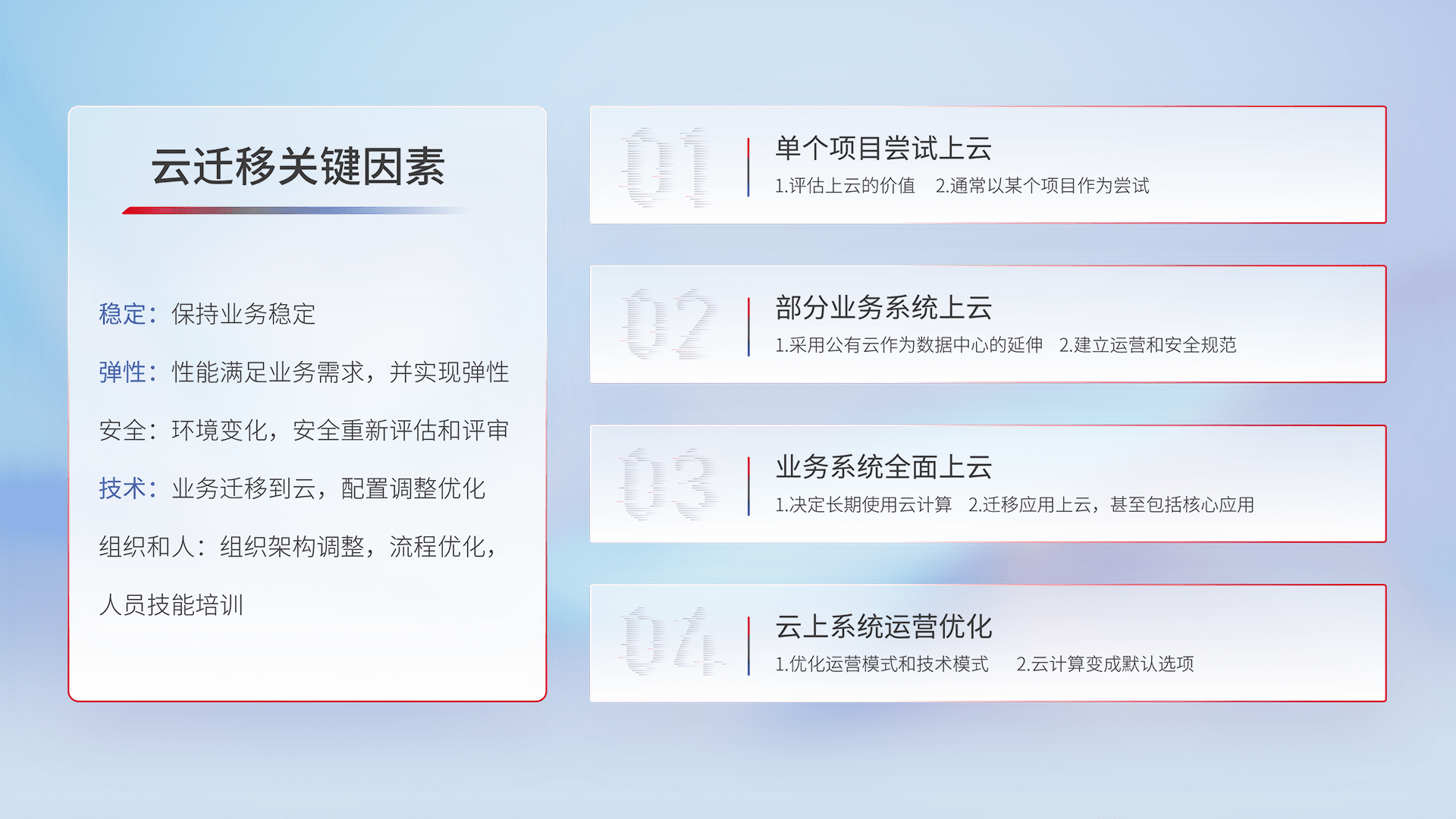 结合实际业务,,,从规划设计、、、、云平台选型、、云原生改造、、数据迁移、、集成交付,,,,迁移全过程为客户识别最佳上云路径,,,,做好风险识别管理,,,设计网络架构、、身份权限、、、、安全审计合规、、、、操作审计、、、日志审计、、、监控告警策略、、、、多站点容灾设计等,,,对云上基础设施进行整体规划,,,,提升IT治理水平,,以满足弹性、、、高可用、、、高性能的需求。。