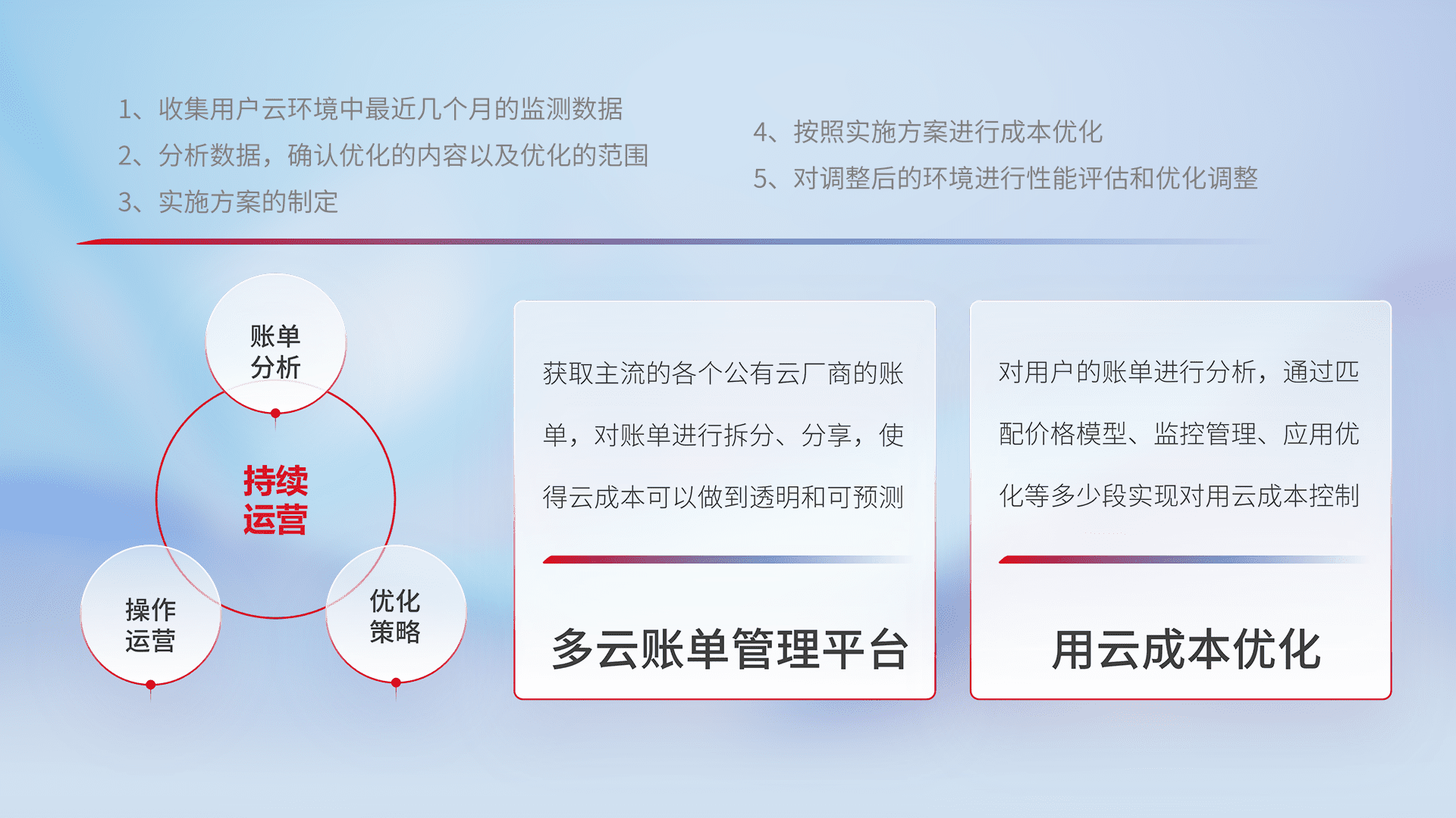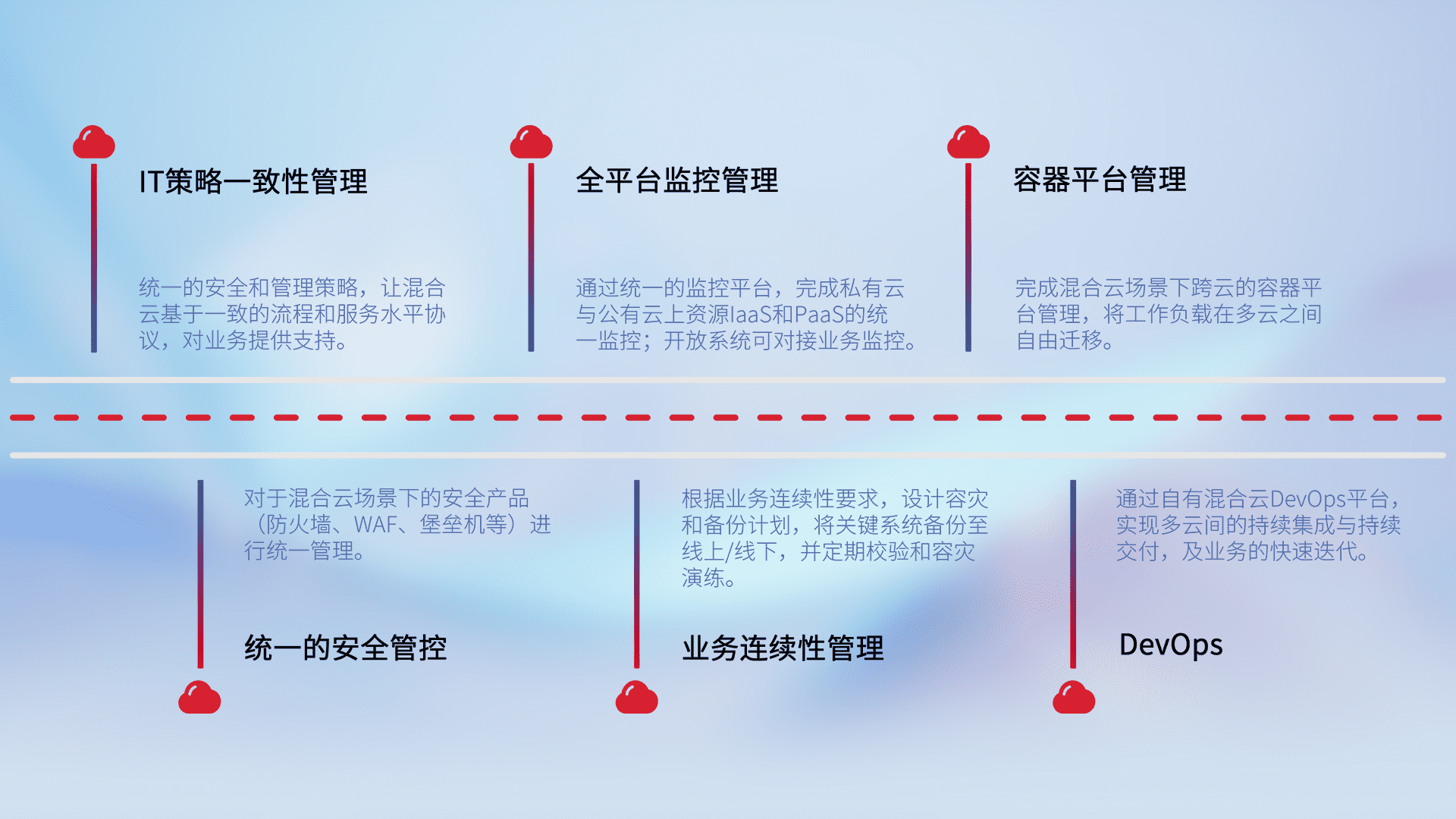 通过多云纳管,,以统一的资源数据模型把客户的云资源进行抽象和封装,,,进而实现对多云资源的统一操作,,,保障云资源管理的可靠性、、、稳定性与可用性。。。量身定制化运维内容,,配置、、、、开发运维、、、、补丁管理、、备份、、、、监控、、、认证和访问管理、、、、审计和日常巡检等,,,保障在用云过程中的可靠度,,,稳定度以及高可用率。。。